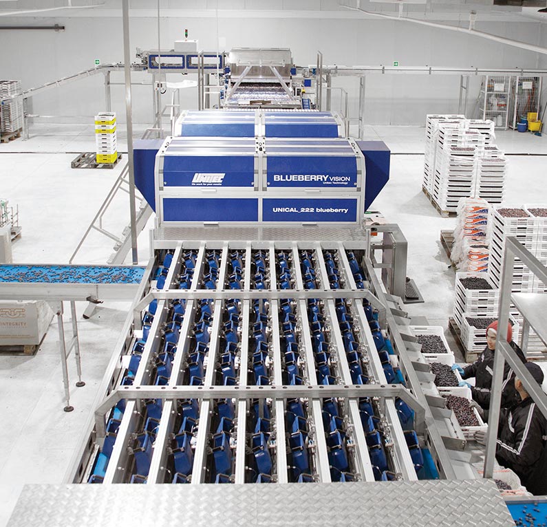 > Blueberry Vision per i mirtilli. È la tecnologia pioniera nel campo della selezione e classificazione dei mirtilli. Il primo sistema, unico nel suo genere che garantisce la possibilità di visionare il 100% della superficie del mirtillo, senza danneggiarlo, migliorando considerevolmente l’affidabilità nella selezione e classificazione del prodotto prima della sua immissione sul mercato.